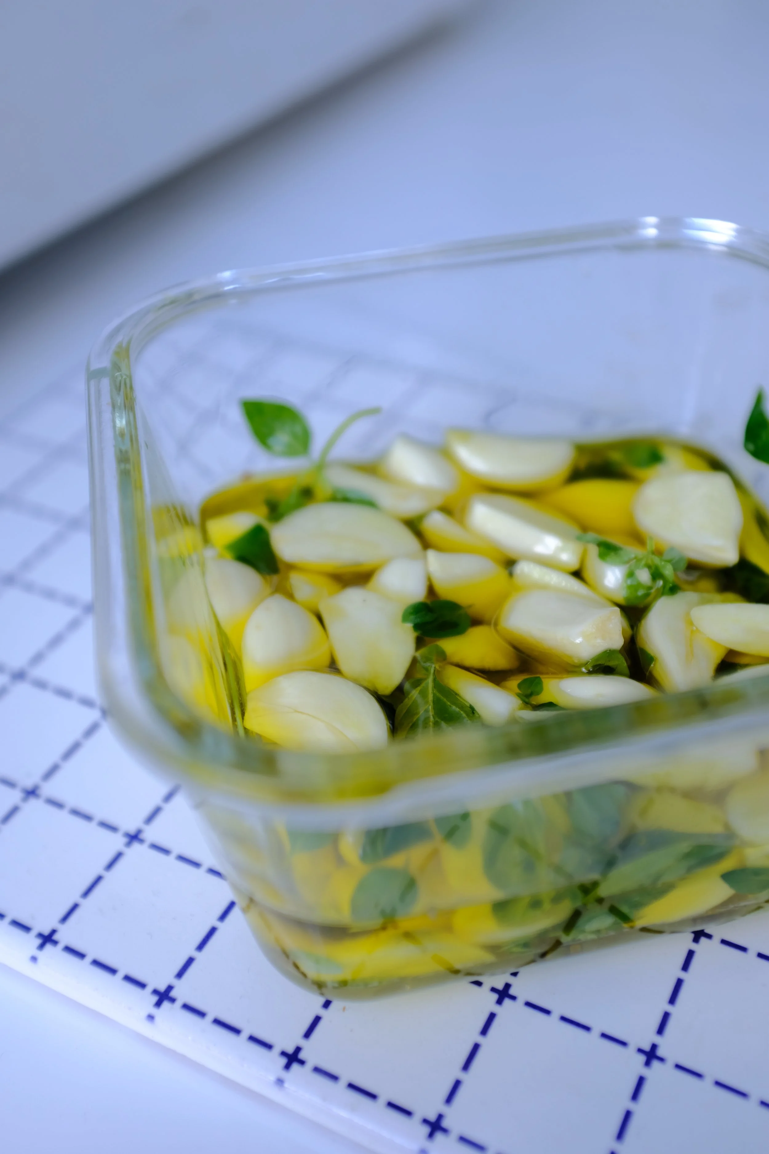 Hvidløg i olie med krydderurter - geniale som tilbehør til grillmaden, som topping oven på en buddha bowl, blandet med i salaten eller endda på en frokostmad. De her hvidløg i olie er supernemme at lave, smager dejligt og kan holde længe. Du får min opskrift på dem i dette indlæg.